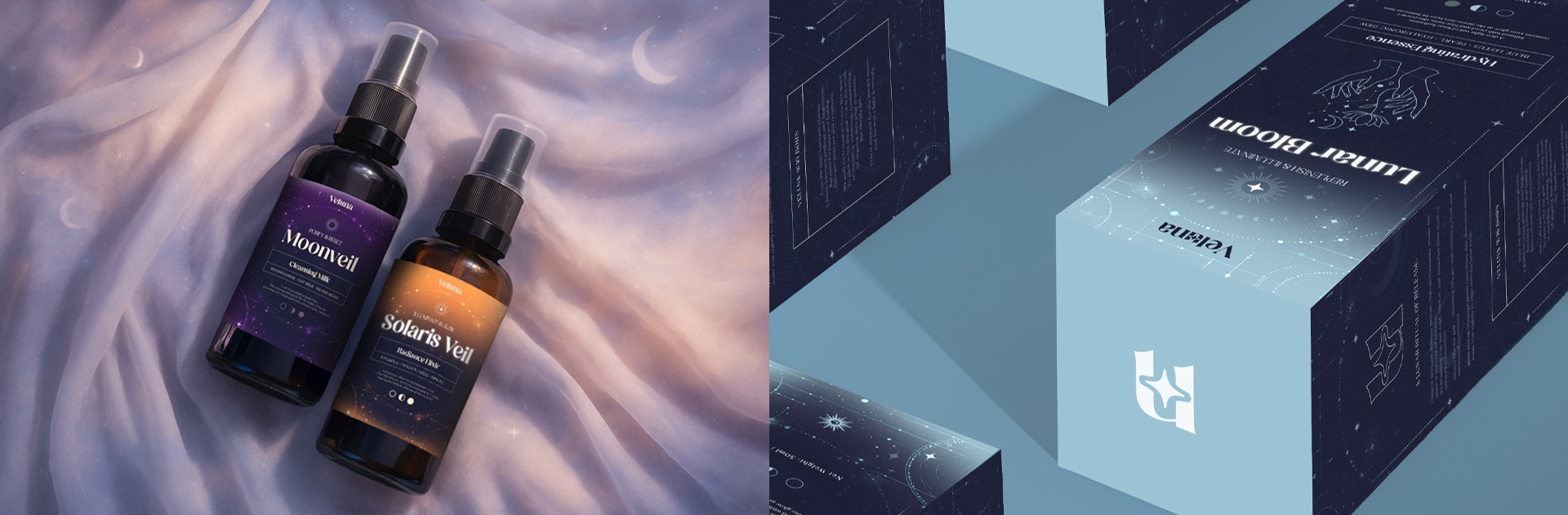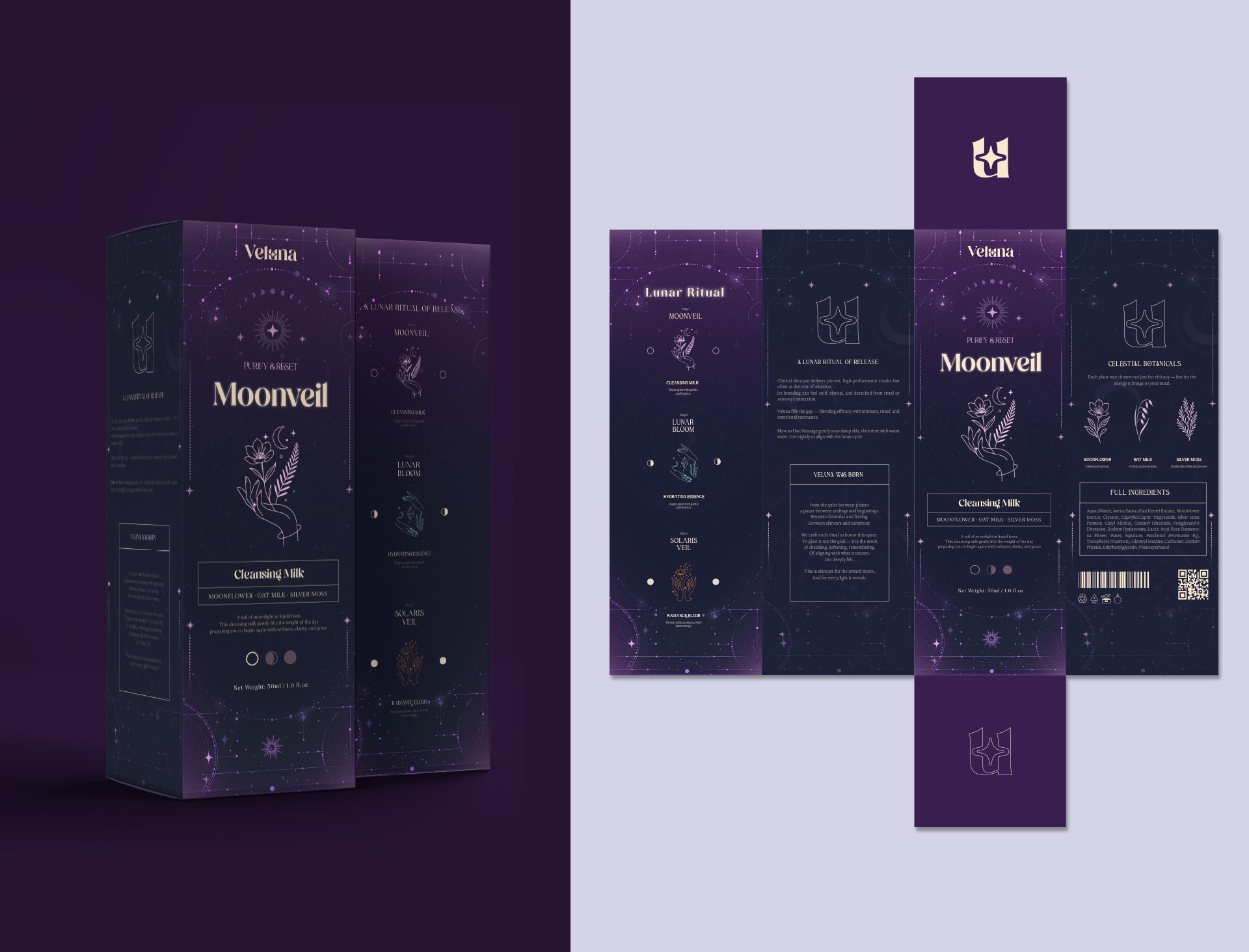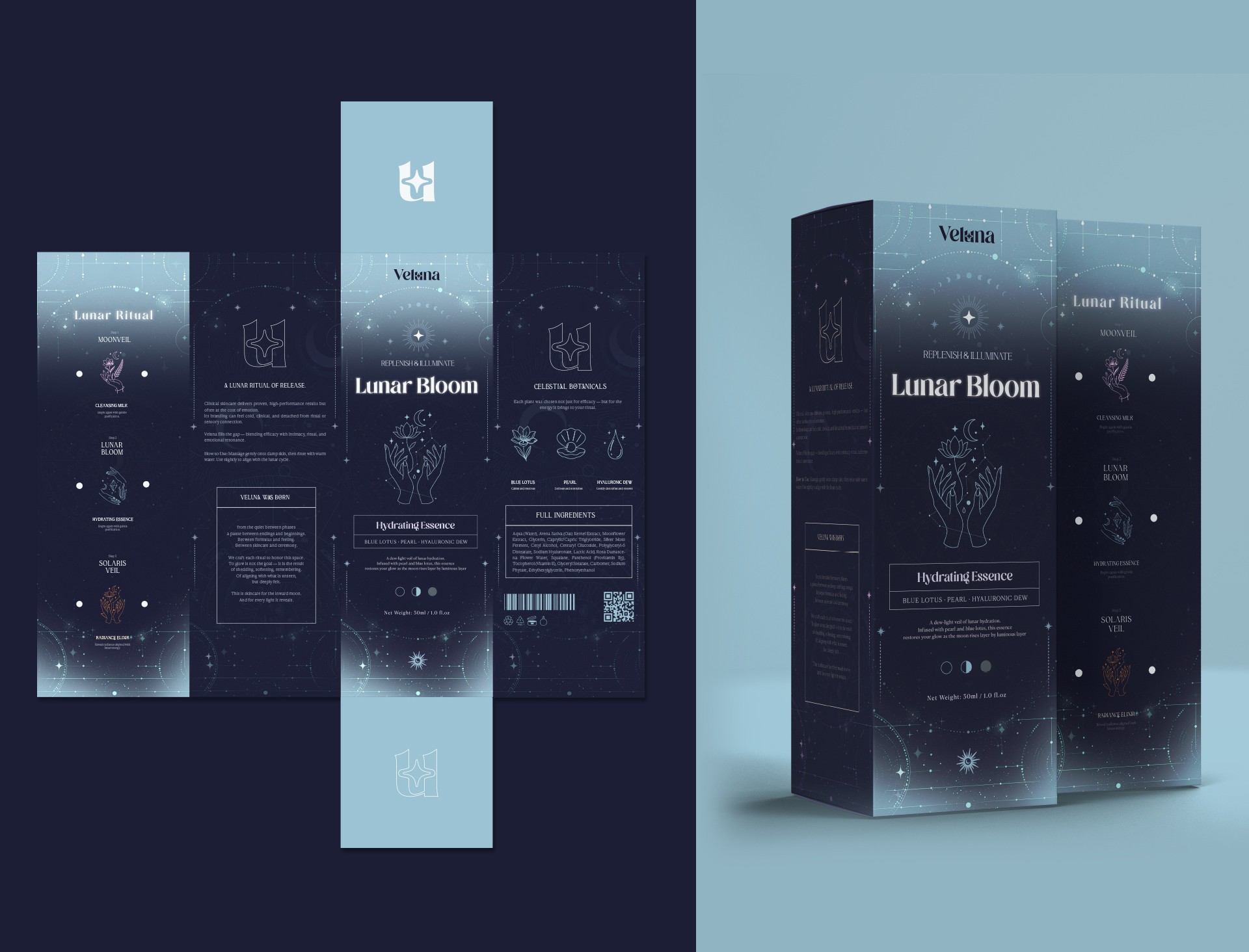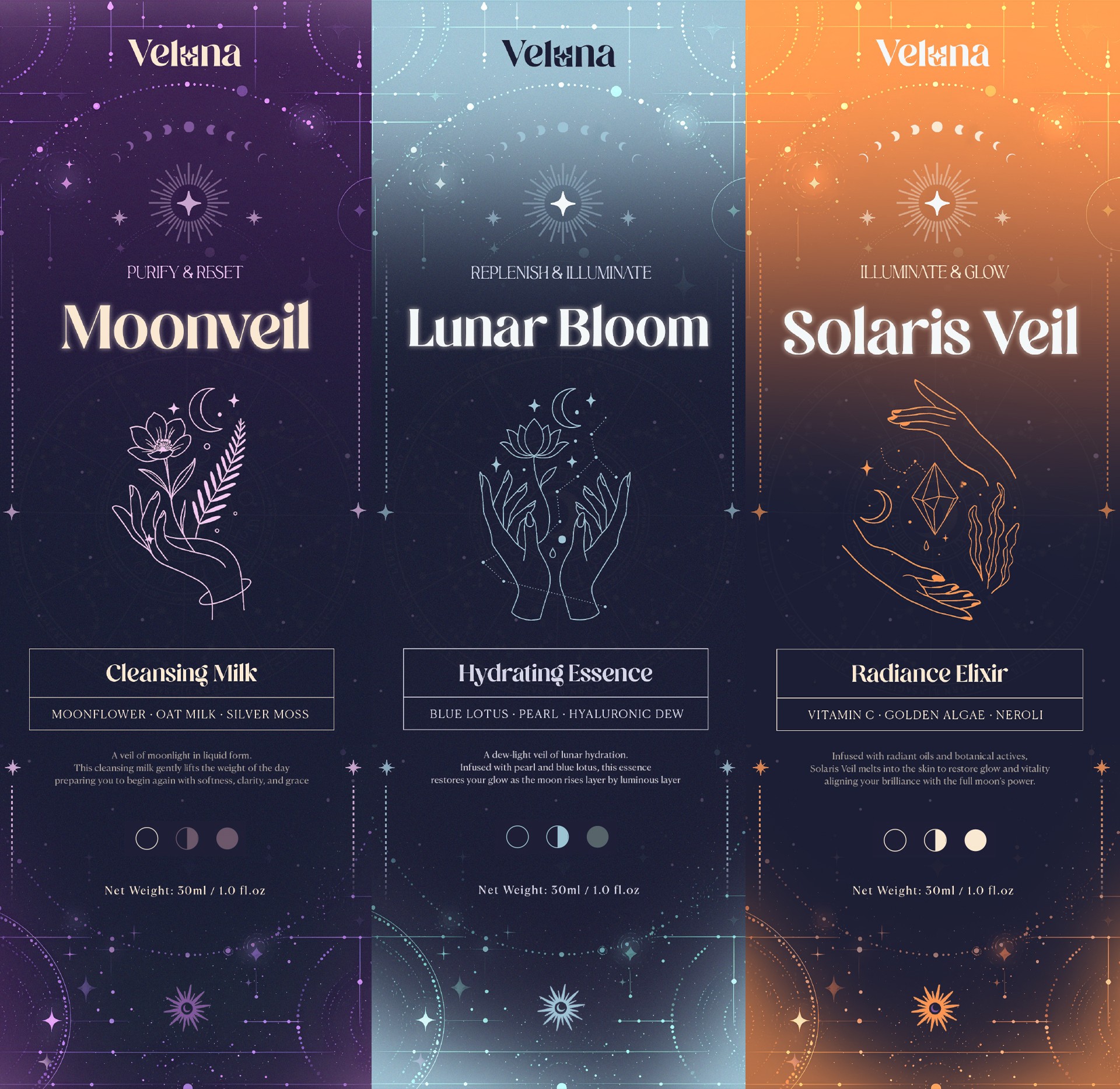 Inspired by celestial cycles and the quiet rhythm of night, Veluna transforms everyday skincare into a calming experience. Through poetic branding, atmospheric visuals, and refined packaging, the brand invites users to slow down and reconnect with themselves.