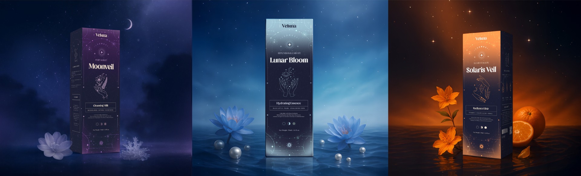 The result is a skincare identity that feels intentional, immersive, and emotionally resonant, positioning Veluna as more than a product, but as a nightly ritual.